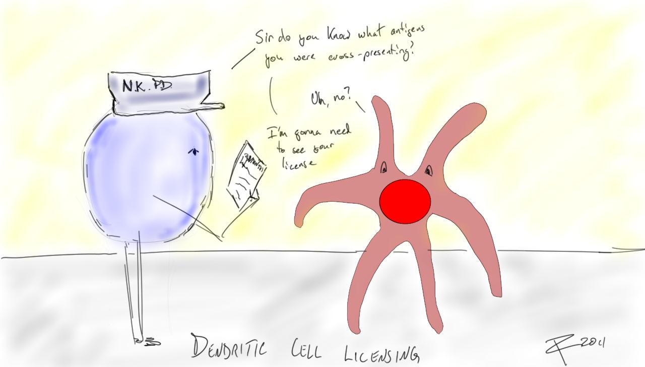 | 47 Dendritic Cell Licensing "This must just be a big misunderstanding, Officer. Aren't we related? We share a common Progenitor Cell, don't we? Can't you let me off this once?" |